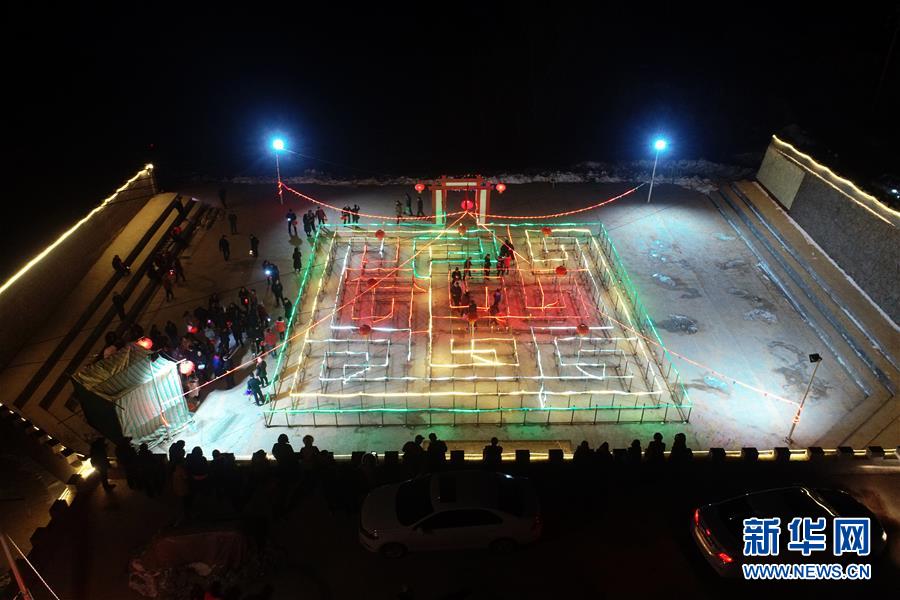 在武鄉(xiāng)縣大有鄉(xiāng)王莊溝村廣場(chǎng)上,村民們?cè)诰徘S河燈陣中觀燈(2月16日無人機(jī)拍攝)。 新華社記者 詹彥 攝