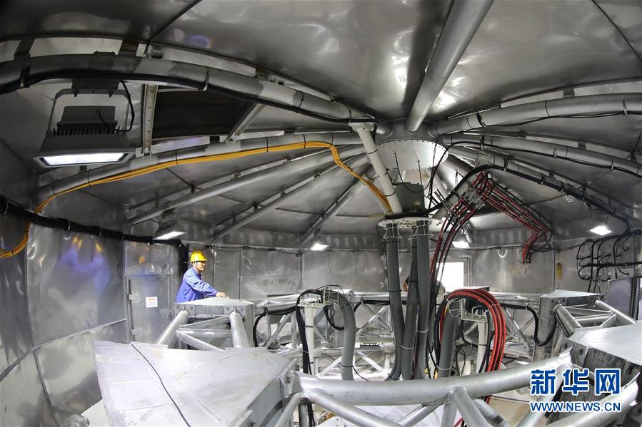 8月28日,工作人員在FAST饋源艙內(nèi)進(jìn)行檢修。 新華社記者 歐東衢 攝