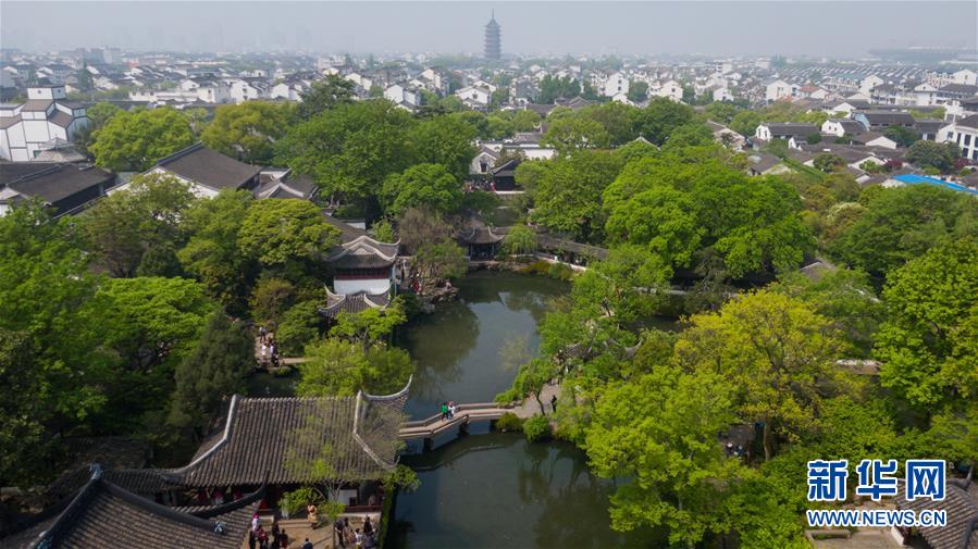 這是5月9日無人機(jī)拍攝的江蘇蘇州拙政園。 新華社記者李博攝