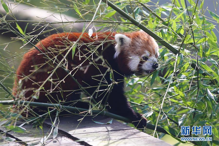 8月24日,在比利時(shí)布呂熱萊特市,一只小熊貓?jiān)谔焯脛?dòng)物園的“中國(guó)園”覓食。新華社記者 鄭煥松 攝