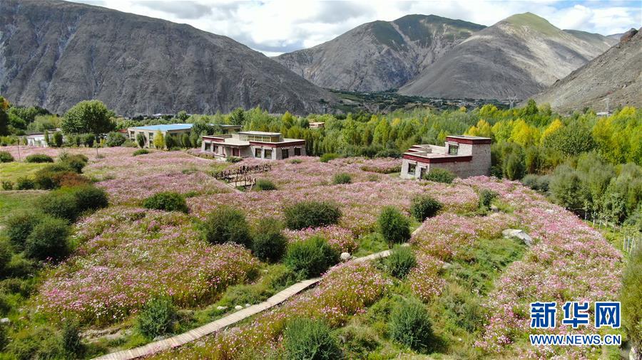 9月13日無人機(jī)拍攝的尼木縣山谷間盛開的波斯菊。 新華社記者 晉美多吉 攝