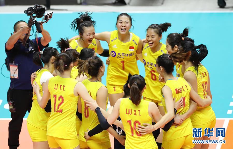 9月23日,中國(guó)隊(duì)球員慶祝比賽勝利。當(dāng)日,在日本札幌舉行的2019年女排世界杯賽第二階段A組循環(huán)賽中,中國(guó)隊(duì)以3比0戰(zhàn)勝美國(guó)隊(duì)。新華社記者杜瀟逸攝