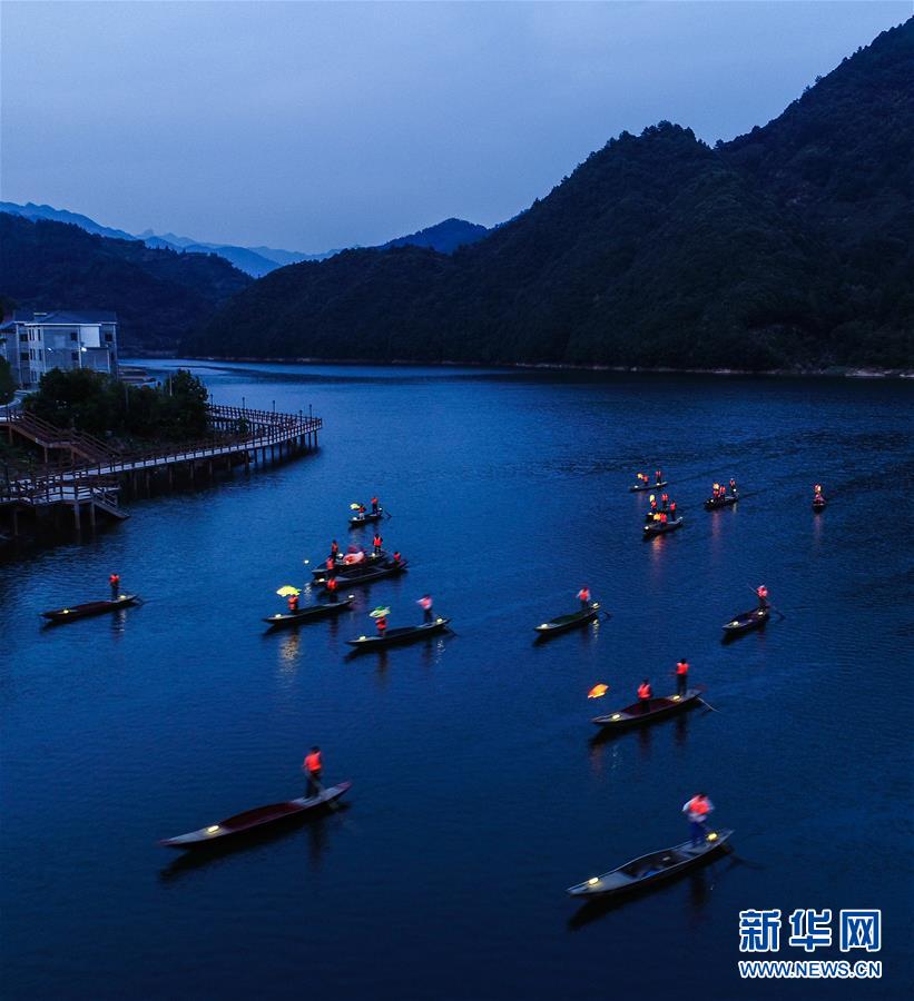9月25日,在宋村鄉(xiāng)云源港的水面上,漁民劃著漁船,船頭點亮漁燈,構成一幅“漁舟唱晚、萬家燈火”的美麗圖景(無人機拍攝)。 新華社記者 徐昱 攝