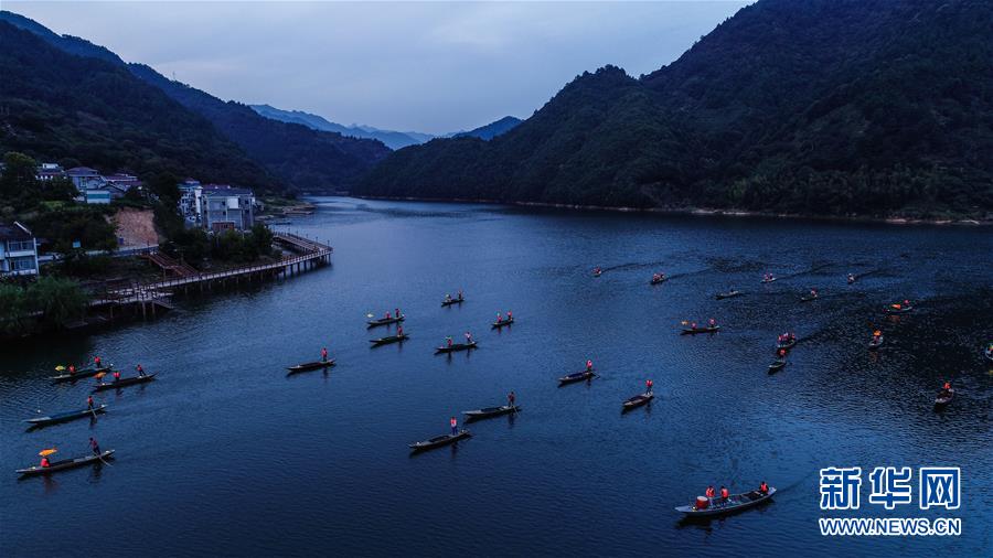 9月25日,在宋村鄉(xiāng)云源港的水面上,漁民劃著漁船,船頭點亮漁燈,構(gòu)成一幅“漁舟唱晚、萬家燈火”的美麗圖景,與沿湖民宿群落交相輝映(無人機拍攝)。 新華社記者 徐昱 攝