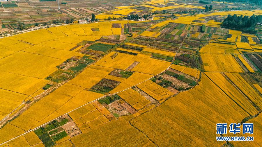 這是9月30日無人機拍攝的河北省涉縣白芟村的稻田。 近日,位于太行山下的河北省涉縣白芟村上千畝水稻逐漸成熟。從空中俯瞰,猶如一塊塊“調(diào)色盤”,美不勝收。 新華社記者 王曉 攝