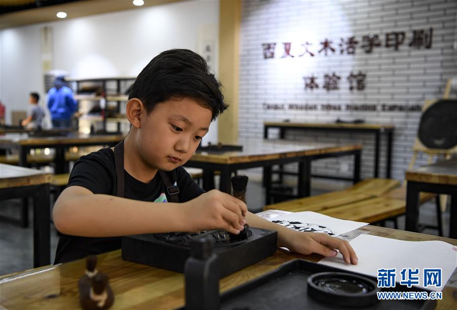 10月2日,游客在寧夏銀川市西夏陵景區(qū)體驗(yàn)西夏文木活字印刷。 新華社記者 馮開華 攝