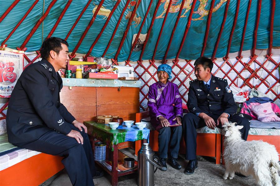9月27日,內(nèi)蒙古自治區(qū)額濟納旗算井子邊境派出所民警走訪看望牧民蘇伊勒圖雅(中)。新華社記者劉磊攝