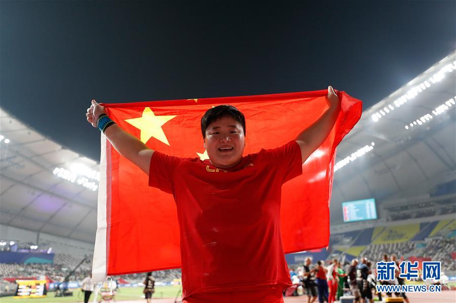 當日,在卡塔爾多哈舉行的2019國際田聯(lián)世界田徑錦標賽女子鉛球決賽中,衛(wèi)冕冠軍、中國選手鞏立姣以19米55的成績奪得冠軍。 新華社記者王麗莉攝