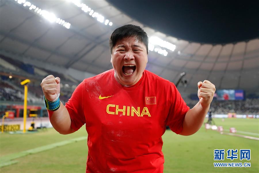 當(dāng)日,在卡塔爾多哈舉行的2019國際田聯(lián)世界田徑錦標(biāo)賽女子鉛球決賽中,衛(wèi)冕冠軍、中國選手鞏立姣以19米55的成績奪得冠軍。 新華社記者王麗莉攝