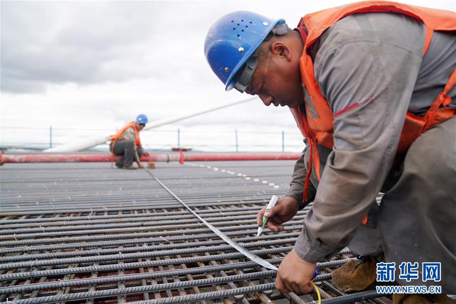 工人在大橋上進行橋面鋪裝施工作業(yè)(8月19日攝)。新華社記者 王建威 攝