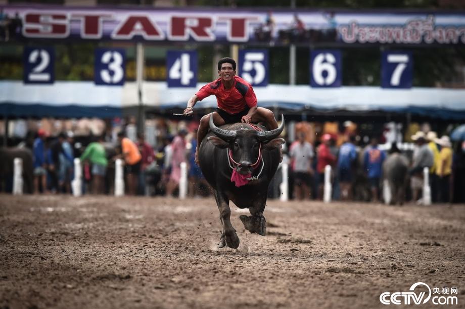當?shù)貢r間2019年10月12日,泰國春武里舉行一年一度的水牛賽跑,選手騎牛狂奔。視覺中國