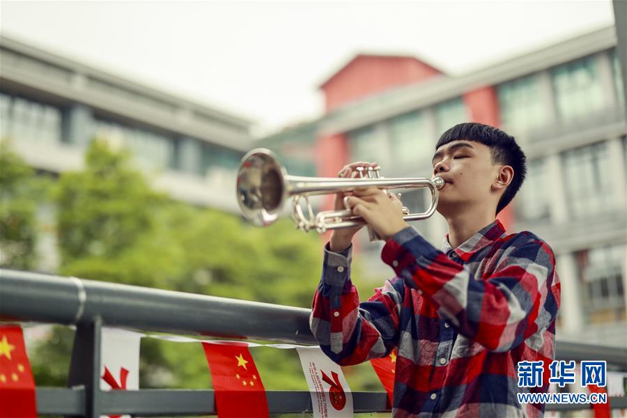 王太樊在教室外的樓道給自己心愛(ài)的小號(hào)試音(10月10日攝)。 新華社記者 劉潺 攝