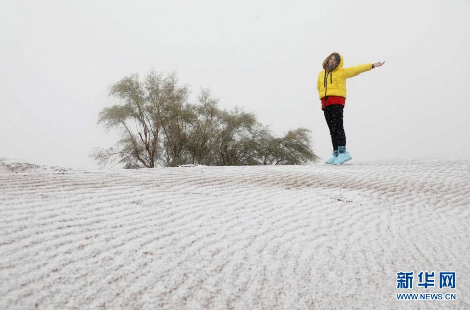 10月15日,游客在寧夏中衛(wèi)市沙坡頭景區(qū)欣賞沙漠雪景。深秋時(shí)節(jié),位于騰格里沙漠邊緣的寧夏中衛(wèi)市沙坡頭景區(qū)迎來一場降雪。漫漫黃沙被覆蓋在皚皚白雪之下,呈現(xiàn)出一種別樣的美。新華網(wǎng)杜文杰攝