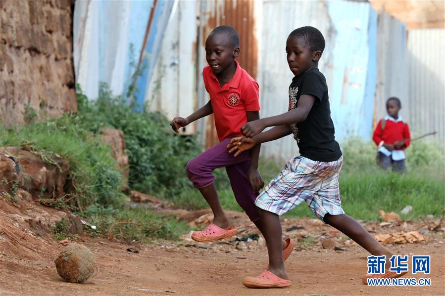 10月16日,在肯尼亞內羅畢基貝拉貧民窟,兩名兒童在路邊踢足球。新華社記者王騰攝