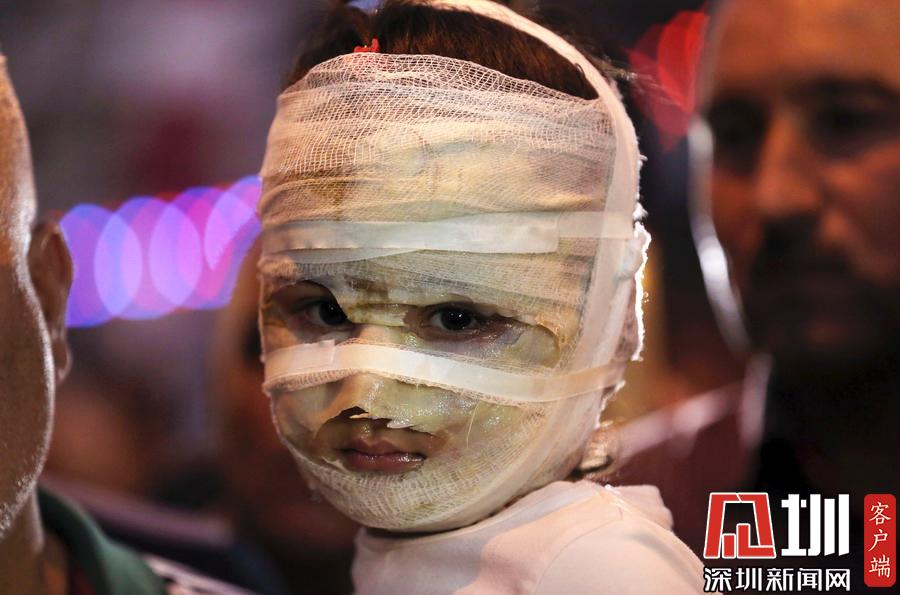 當?shù)貢r間2016年7月9日,伊拉克卡拉達,4歲的Asal Ahmed在爆炸現(xiàn)場被爸爸抱著。開齋節(jié)期間,Asal和媽媽一起逛街,結(jié)果碰上一起自殺性炸彈襲擊,兩人都嚴重燒傷。