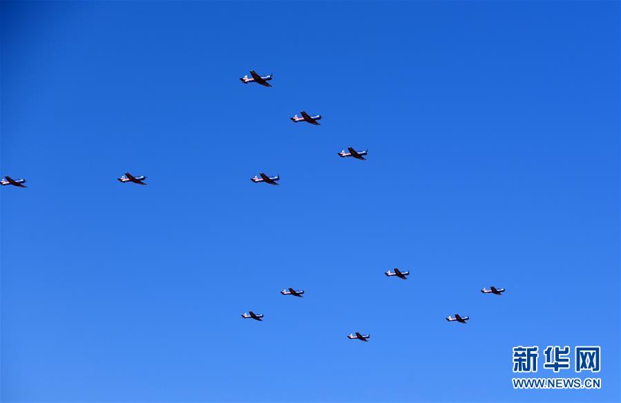 10月17日,“天之翼”飛行表演隊進行飛行表演。 當(dāng)日,慶祝人民空軍成立70周年航空開放活動在吉林長春開幕??哲姸嘀эw行表演隊、跳傘表演隊共舞藍(lán)天,殲-20、運-20、殲-16等多款主力戰(zhàn)機展翅蒼穹,空降兵和航空兵作戰(zhàn)部隊派出精銳力量展示作戰(zhàn)對抗,多型武器裝備大規(guī)模、全系統(tǒng)抵臨現(xiàn)場。人民空軍以前所未有的強大陣容亮相長春,頌揚中國航空事業(yè)110年發(fā)展成就,以開放、自信的姿態(tài)為即將到來的人民空軍70華誕獻上大禮。 新華社記者 張楠 攝