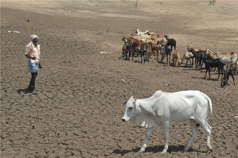 當(dāng)?shù)貢r(shí)間2017年5月30日,印度特倫甘納,印度農(nóng)民在干涸的河床上放羊和牛。NOAH SEELAM/視覺(jué)中國(guó)編輯/陳進(jìn)