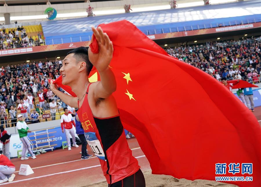 10月24日,中國選手王嘉男在比賽后慶祝。 當日,在武漢舉行的第七屆世界軍人運動會田徑項目男子跳遠決賽中,中國選手王嘉男、黃常洲分別以8米15和8米12的成績獲得冠亞軍。 新華社記者金良快攝