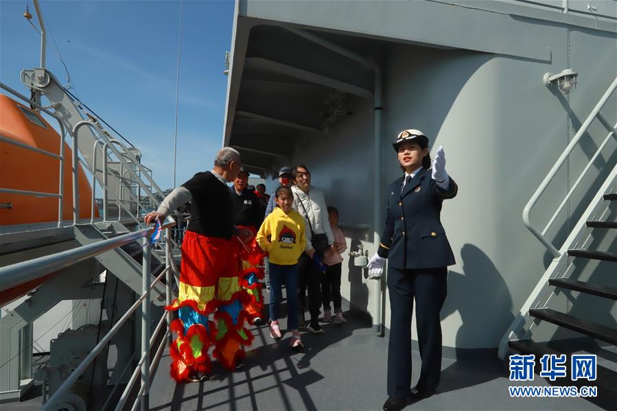 10月26日,在新西蘭首都惠靈頓,中國海軍訓練艦戚繼光艦的學員為參觀群眾進行講解。新華社發(fā)(張雪山攝)