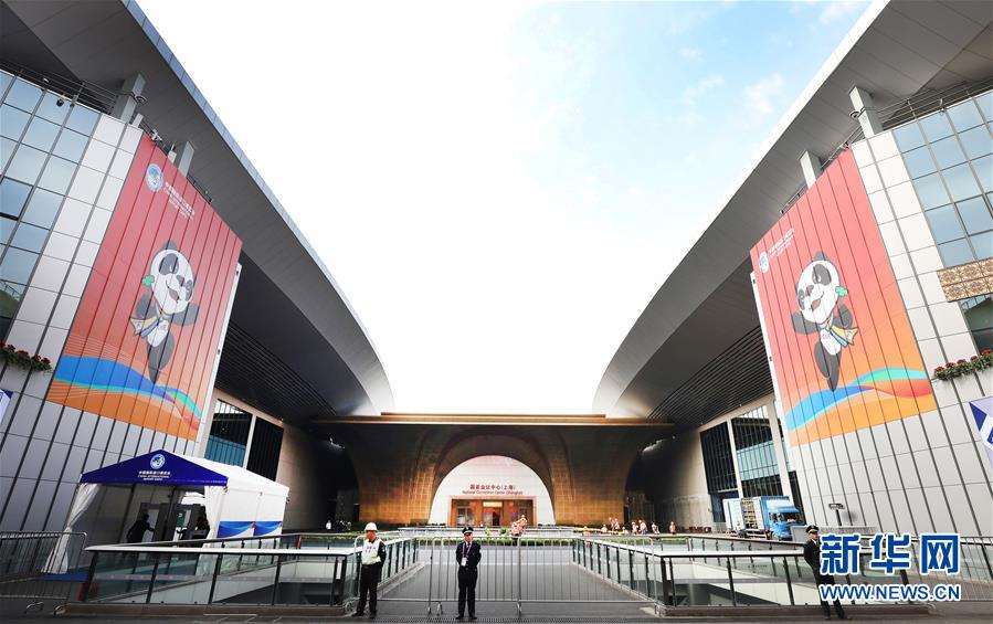 10月25日,位于國展中心內(nèi)的國家會議中心入口處張貼了醒目的進(jìn)博會吉祥物熊貓進(jìn)寶裝飾。 新華社記者 方喆攝
