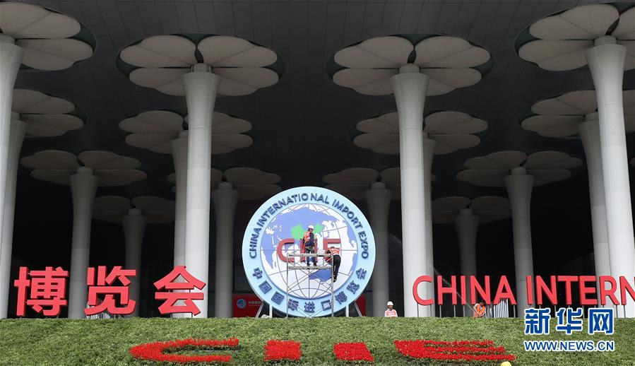 10月25日,施工人員在國(guó)展中心(上海)南廣場(chǎng)安裝進(jìn)博會(huì)標(biāo)志。 新華社記者 方喆攝