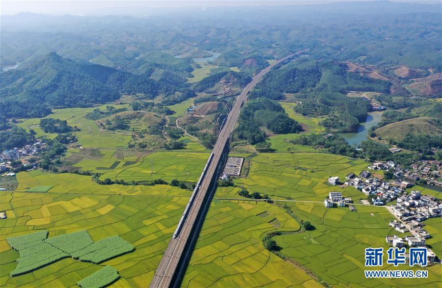 10月29日,列車(chē)從廣西賓陽(yáng)縣古辣鎮(zhèn)豐收的稻田間駛過(guò)(無(wú)人機(jī)拍攝)。