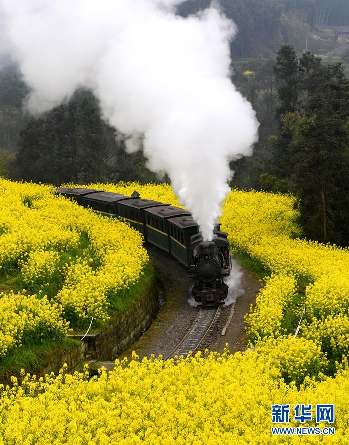 3月20日,一列嘉陽(yáng)小火車(chē)在油菜花叢中穿行。