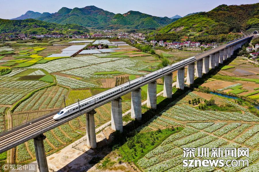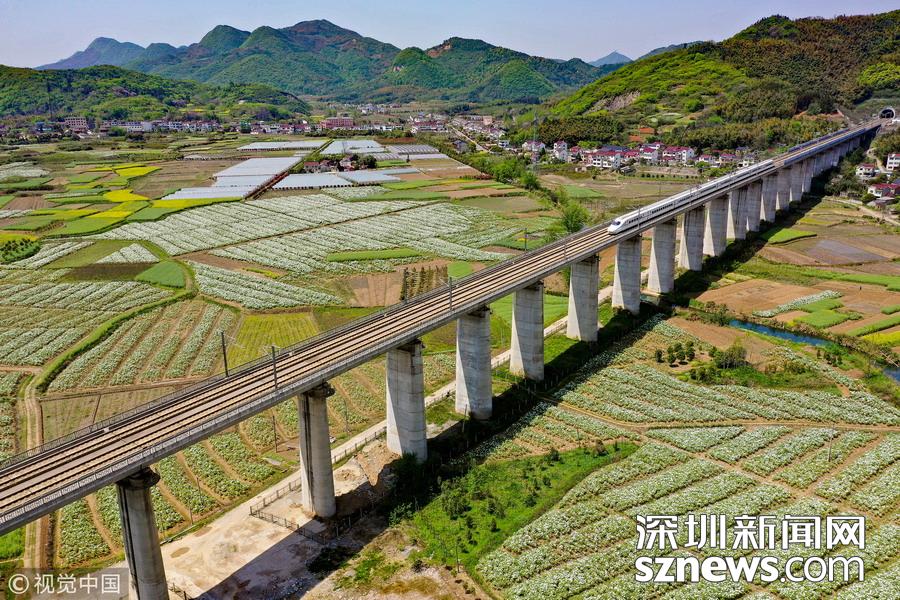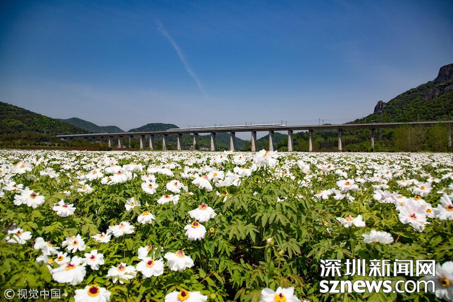 2019年4月8日,一列高鐵列車(chē)從京福高鐵安徽銅陵段一片盛開(kāi)的鳳丹花海中駛過(guò)。