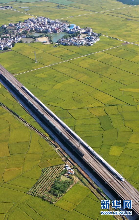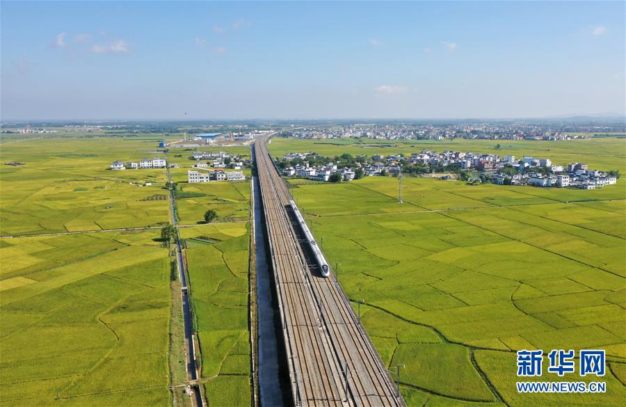 10月29日,列車(chē)從廣西賓陽(yáng)縣古辣鎮(zhèn)豐收的稻田間駛過(guò)(無(wú)人機(jī)拍攝)。新華社記者陸波岸攝