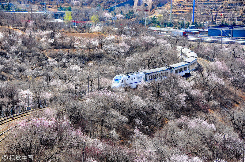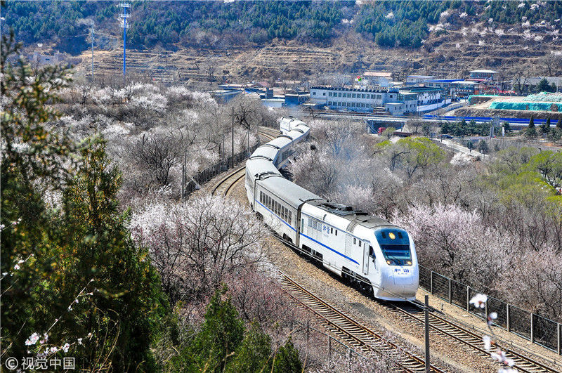 2019年3月22日,北京居庸關(guān)附近的山花盛開(kāi),S2線(xiàn)列車(chē)穿行在花海之中,構(gòu)成一幅美麗的畫(huà)面。時(shí)永平/千龍圖像/視覺(jué)中國(guó)編輯/陳進(jìn)