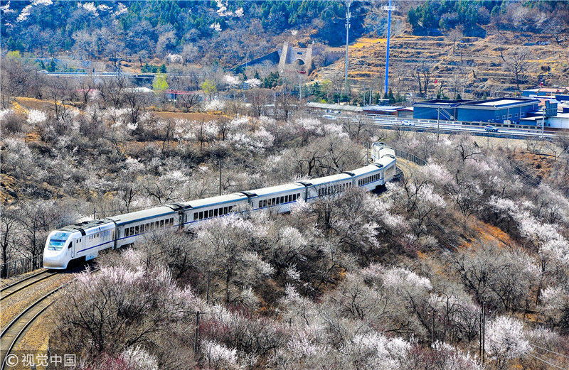 2019年3月22日,北京居庸關(guān)附近的山花盛開(kāi),S2線(xiàn)列車(chē)穿行在花海之中,構(gòu)成一幅美麗的畫(huà)面。
