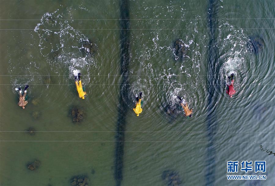 樂亭縣姜各莊鎮(zhèn)一處海參養(yǎng)殖基地的工人在捕撈海參(10月30日無人機拍攝)。