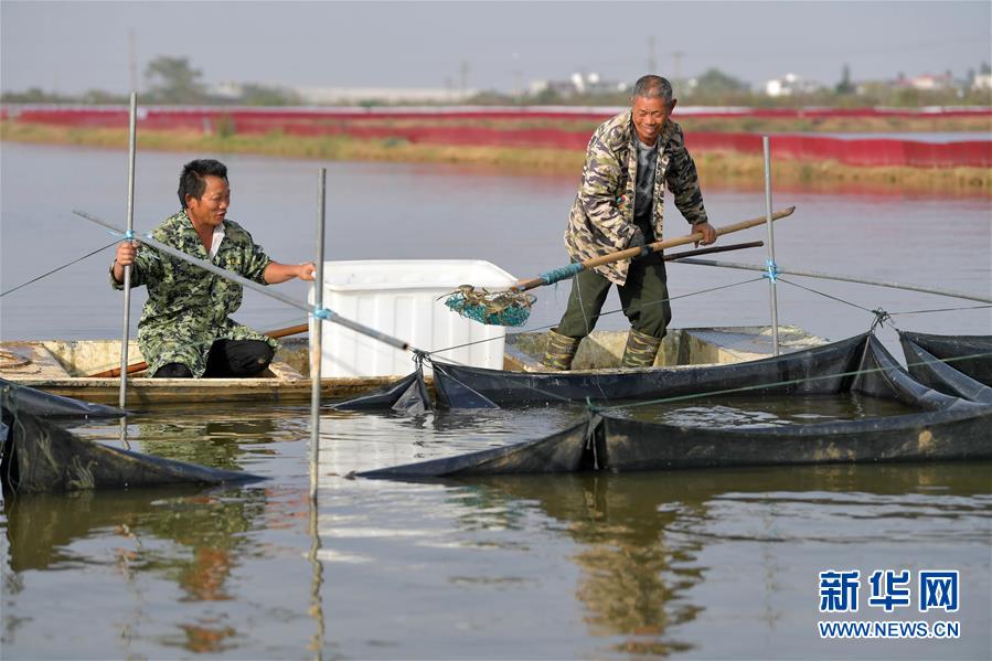 江西省南昌市新建區(qū)象山鎮(zhèn)河林村農(nóng)戶(hù)正在大閘蟹養(yǎng)殖基地進(jìn)行捕撈(10月29日攝)。 新華社記者 彭昭之 攝