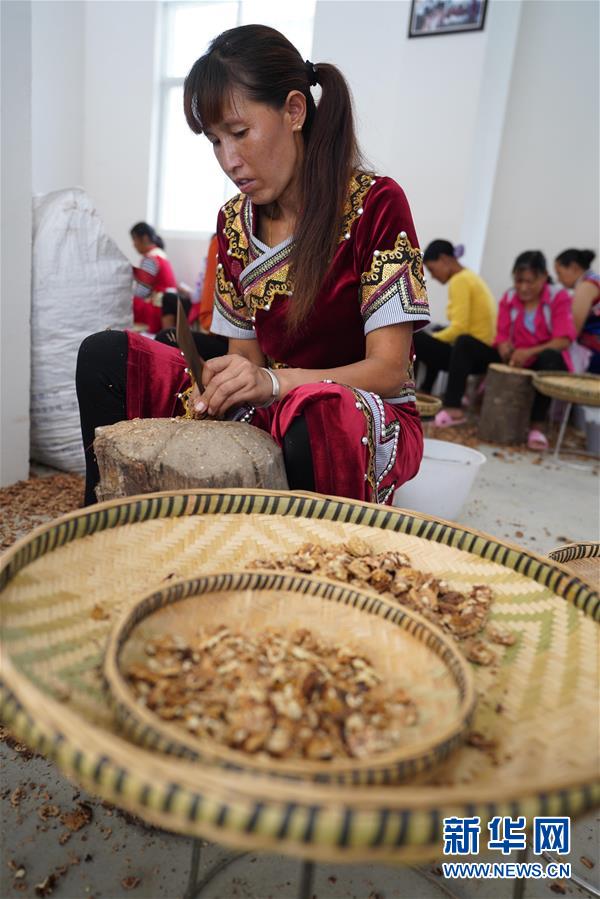 在大興地鎮(zhèn)維拉壩“珠海小區(qū)”內(nèi)的農(nóng)產(chǎn)品加工扶貧車間,村民們在剝核桃仁(6月24日攝)。新華社記者胡超攝