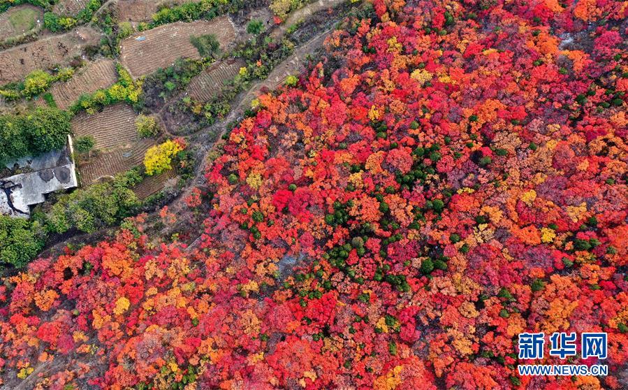 濟(jì)南蝎子山上火紅的黃櫨樹林(11月4日無人機(jī)拍攝)。 新華社記者 朱崢 攝