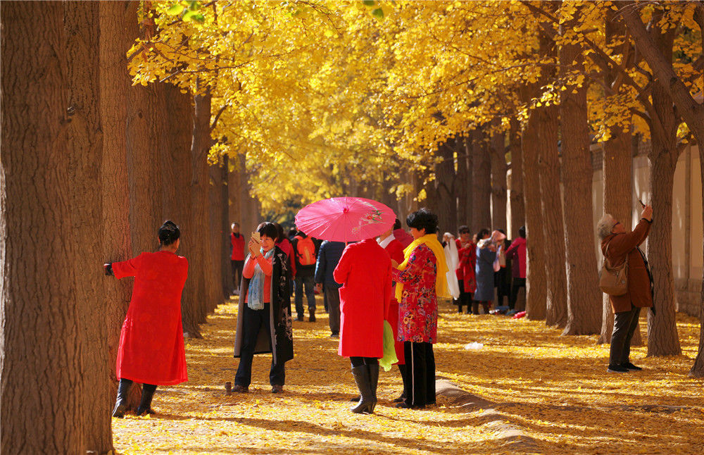 2019年11月11日,北京,西城區(qū)三里河數(shù)百米銀杏大道一片金黃,吸引眾多游人欣賞拍照。
