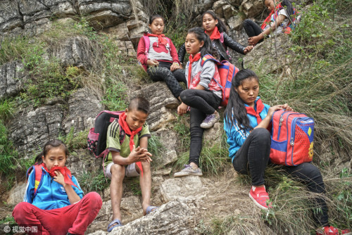 5月14日是家長接孩子的日子,清晨6點多,30多歲的陳古吉帶著背包繩和另外兩個家長一起下山接孩子。村里身手敏捷的年輕人,下山通常需要1小時,上山大約90分鐘,對于外來的人,通常是這個時間的兩倍。 圖片來源:視覺中國