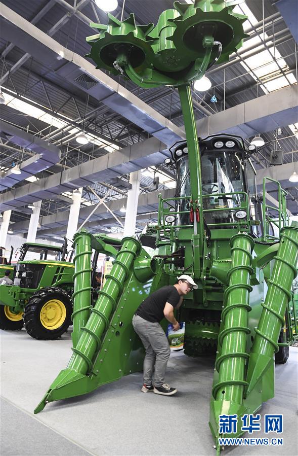 11月16日,參觀者在展會現(xiàn)場參觀甘蔗收割機械設(shè)備。新華社記者曹祎銘攝