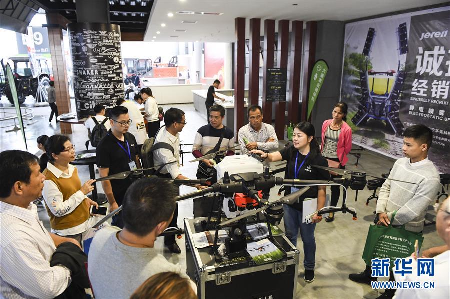 11月16日,參展商在展會(huì)現(xiàn)場(chǎng)給參觀者介紹植保無人機(jī)的使用方法。新華社記者曹祎銘攝