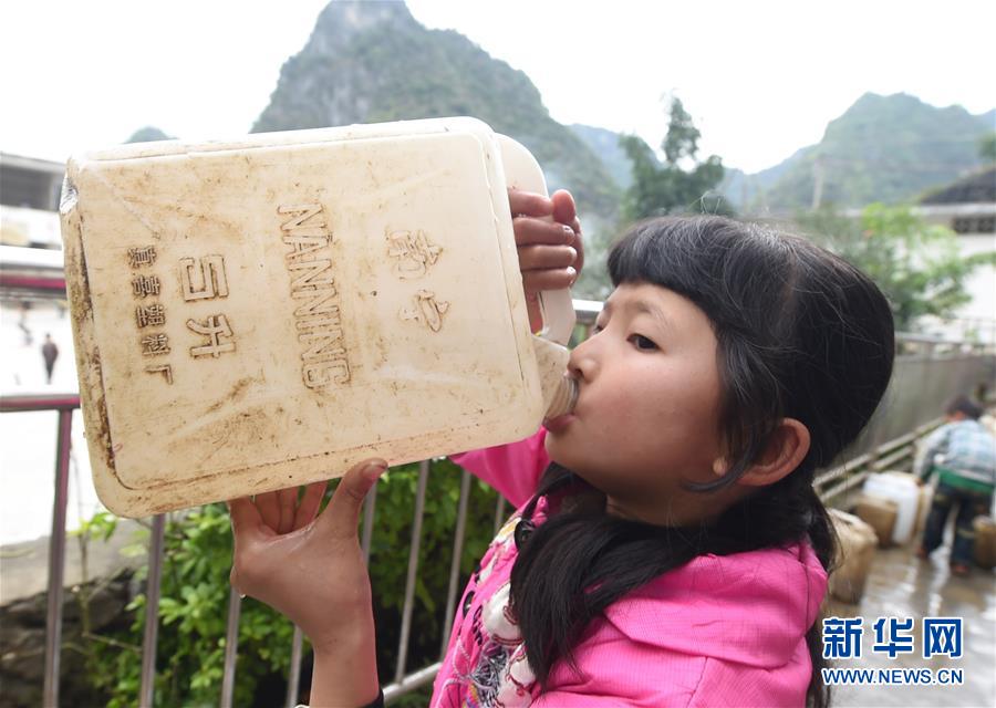在廣西大化瑤族自治縣板升鄉(xiāng)八好小學(xué),一名學(xué)生喝水桶里的雨水(2014年11月24日攝)。八好小學(xué)有400多名學(xué)生,曾僅有一個不足100立方米的水柜,用于收集儲存樓頂?shù)挠晁瑢W(xué)生需定期定量用水。遇到長時間不下雨,學(xué)校需要到鄉(xiāng)政府所在地運(yùn)水。如今,學(xué)校修建了5個大水柜,并從兩公里外引泉水到校園,飲水難問題得到解決。新華社記者黃孝邦攝