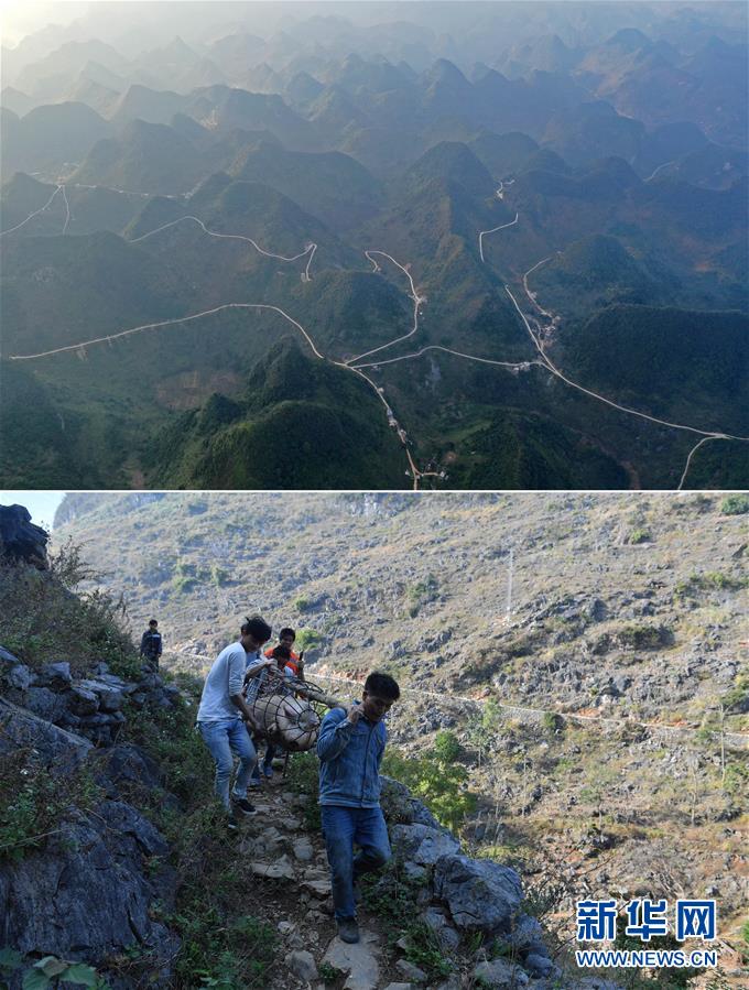 拼版照片:上圖為已經(jīng)通路的大化瑤族自治縣七百弄鄉(xiāng)弄雄村弄桃屯以及周邊村屯(11月10日無人機(jī)拍攝);下圖為在尚未通路的弄雄村弄桃屯,村民抬著準(zhǔn)備出售的土豬走在山路上(2016年12月8日攝)。新華社記者黃孝邦攝