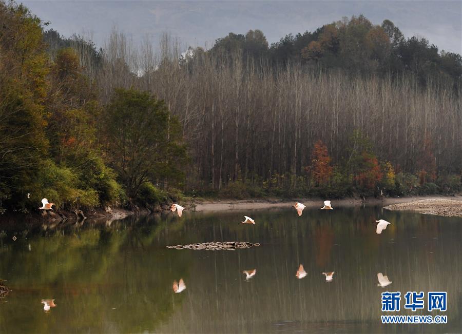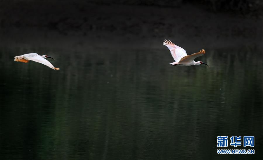 11月19日,朱鹮在漢江支流的牧馬河上空翱翔。  新華社記者陶明攝