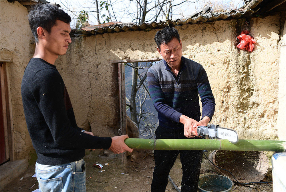 2019年11月16日,四川涼山,裝好電鋸后,楊陽的父親某色蘇拉澤開始試用起來。