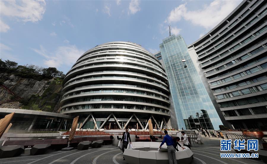 工作人員在礦坑底部的酒店親水平臺布置座椅(11月13日攝)。新華社記者方喆攝