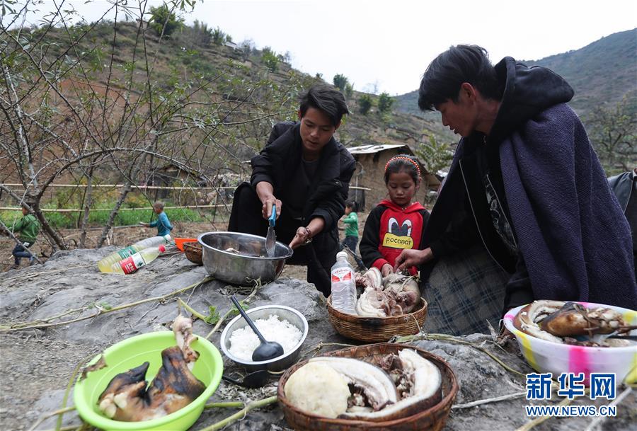 11月24日,在昭覺(jué)縣支爾莫鄉(xiāng)阿土列爾村,當(dāng)?shù)鼐用駵?zhǔn)備熟食、酒等食物祭祖,并相互贈(zèng)送。11月20日至26日是四川省涼山彝族自治州大小涼山彝族群眾傳統(tǒng)節(jié)日——彝族年,懸崖上的阿土列爾村的彝族群眾殺年豬、祭祀和走親拜年,慶祝一年一度的彝族年。阿土列爾村是“懸崖村”,位于四川省涼山彝族自治州昭覺(jué)縣支爾莫鄉(xiāng),坐落在海拔1400-1600米山坳中,這里居住著60多戶(hù)彝族群眾,村民走出大山,需要攀爬懸崖。新華社記者江宏景攝