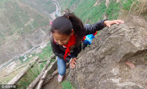 四川省涼山彝族自治州昭覺(jué)縣支爾莫鄉(xiāng)阿土勒爾村,是一座名副其實(shí)的“懸崖村”,72戶(hù)人家居住在這里,處于美姑河大峽谷斷坎巖肩斜臺(tái)地,海拔1400多米,與地面垂直距離約800米。5月14日,放學(xué)路上,孩子們?cè)谂逝捞偬?。圖片來(lái)源:視覺(jué)中國(guó)