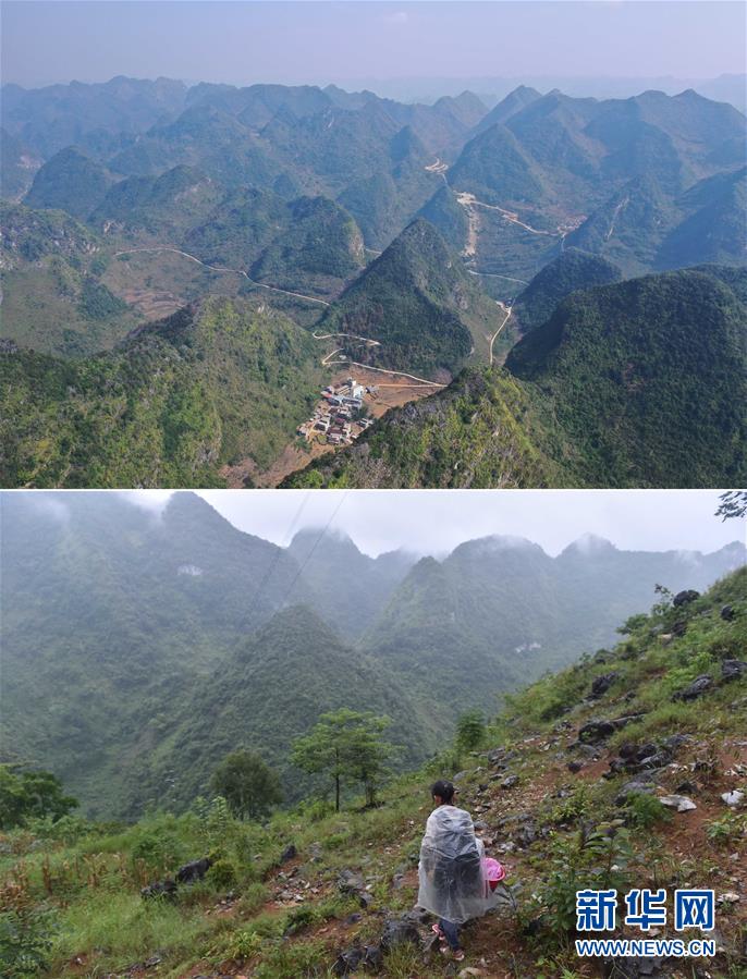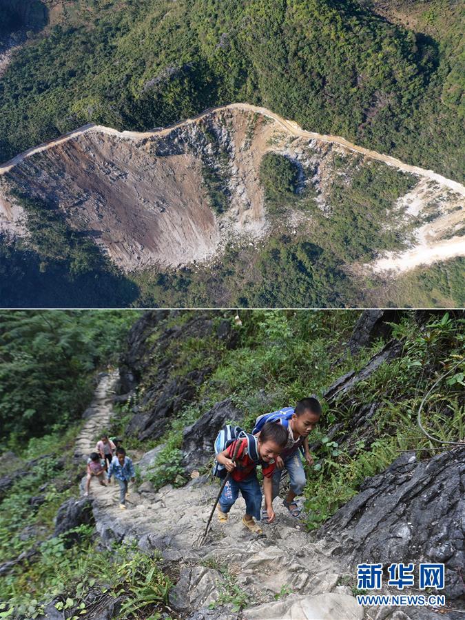 拼版照片:上圖為剛剛修通公路的大化瑤族自治縣板升鄉(xiāng)八好村弄麻屯(11月11日無(wú)人機(jī)拍攝);下圖為在尚未通路的八好村弄麻屯,孩子們爬山路回家(2016年9月23日攝)。新華社記者黃孝邦攝