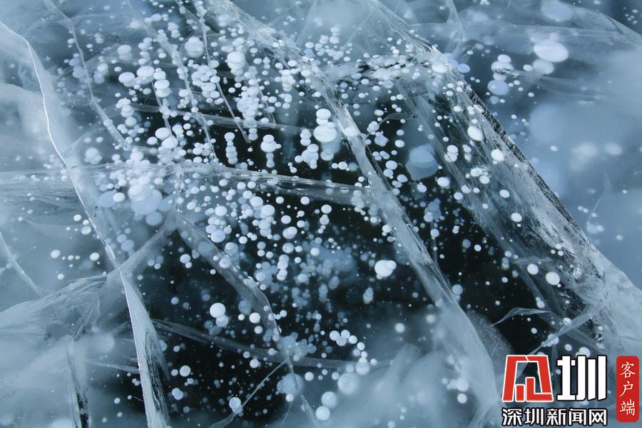 透過晶瑩剔透的冰面,可以看到一串串潔白氣泡分布在冰層中。