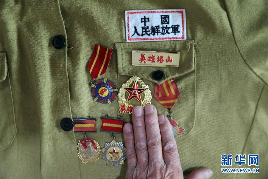 11月7日,張貴斌老人撫摸軍功章。
