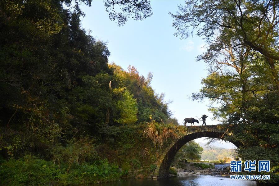婺源縣的詹有社牽牛行走在路上,供游客拍照(11月5日攝)。新華社記者胡晨歡攝